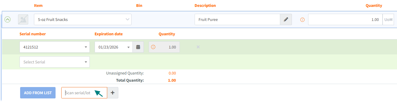 To scan a barcode with your device’s camera, simply tap the Scan button in the mobile app. This button will appear on all screens where barcode scanning is applicable.