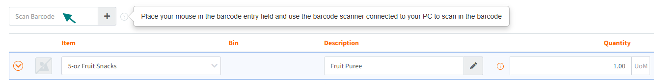 When creating or editing sales or purchase transactions, if you scan an item for the first time, a new item line will be added to the transaction. Each subsequent scan of the same item will increase the quantity.